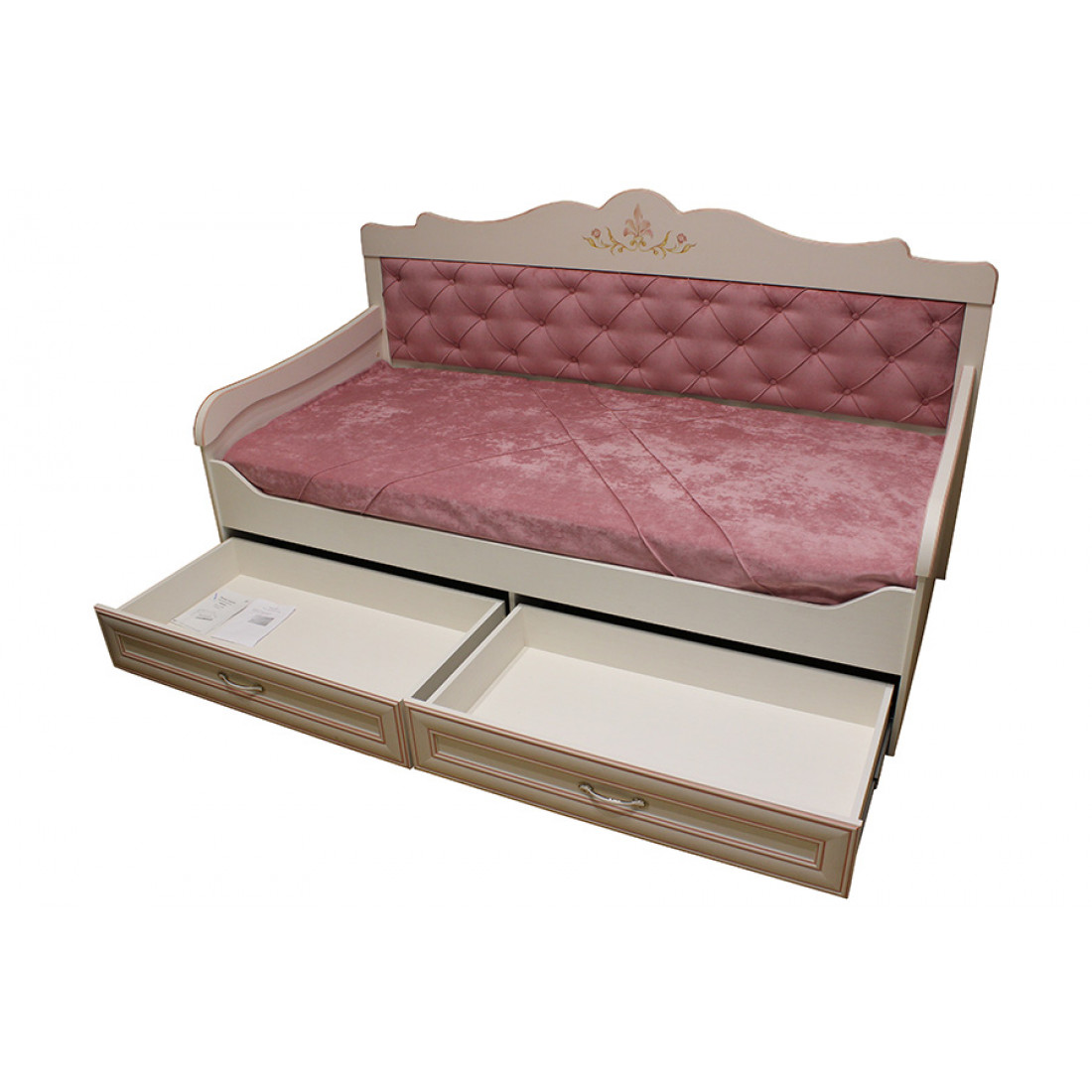 Корпус: ДСП, декор – кремовый белый. Основание кровати – ламели