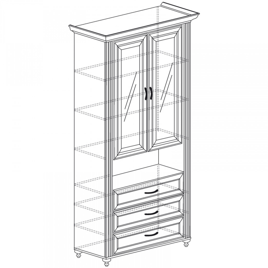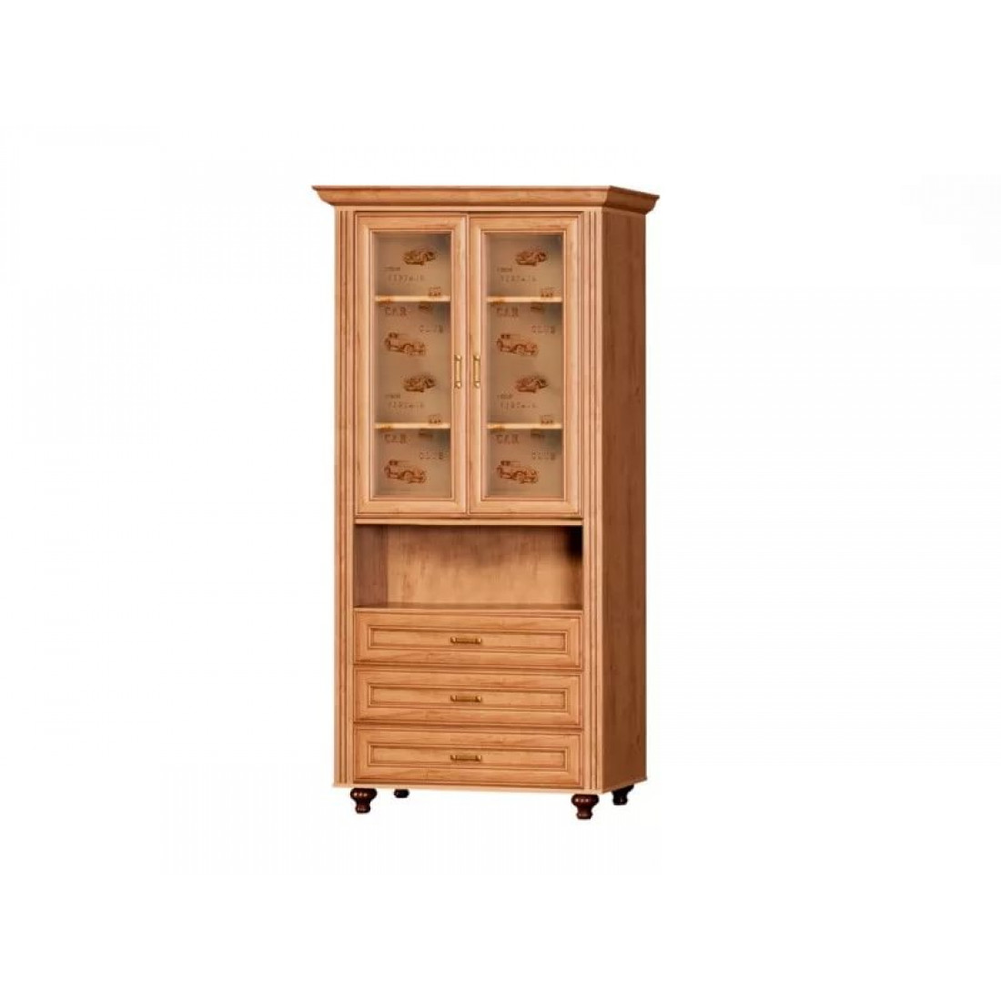 Фасады: МДФ, декор – дуб ридинг, рисунок, патина, стекло с фацетом и рисунком, зеркало