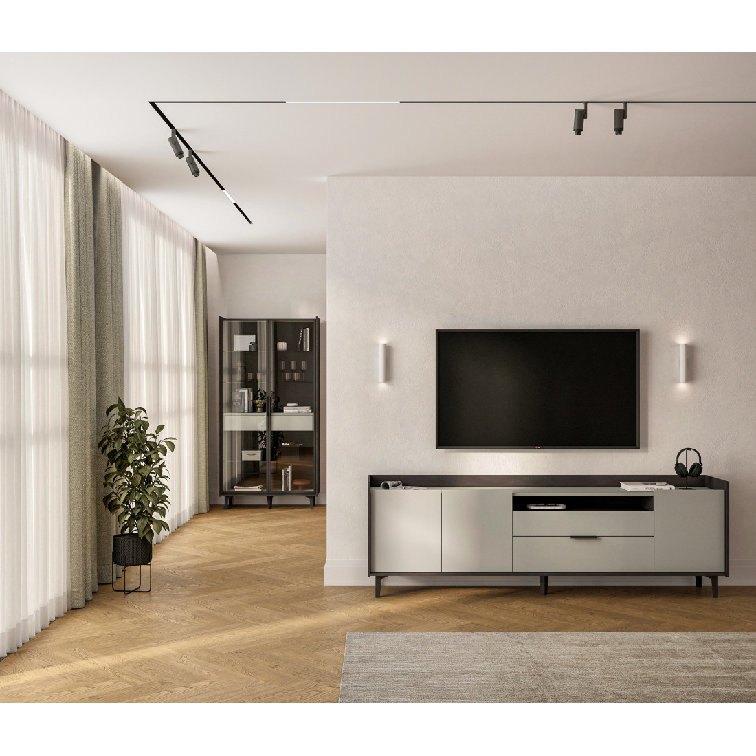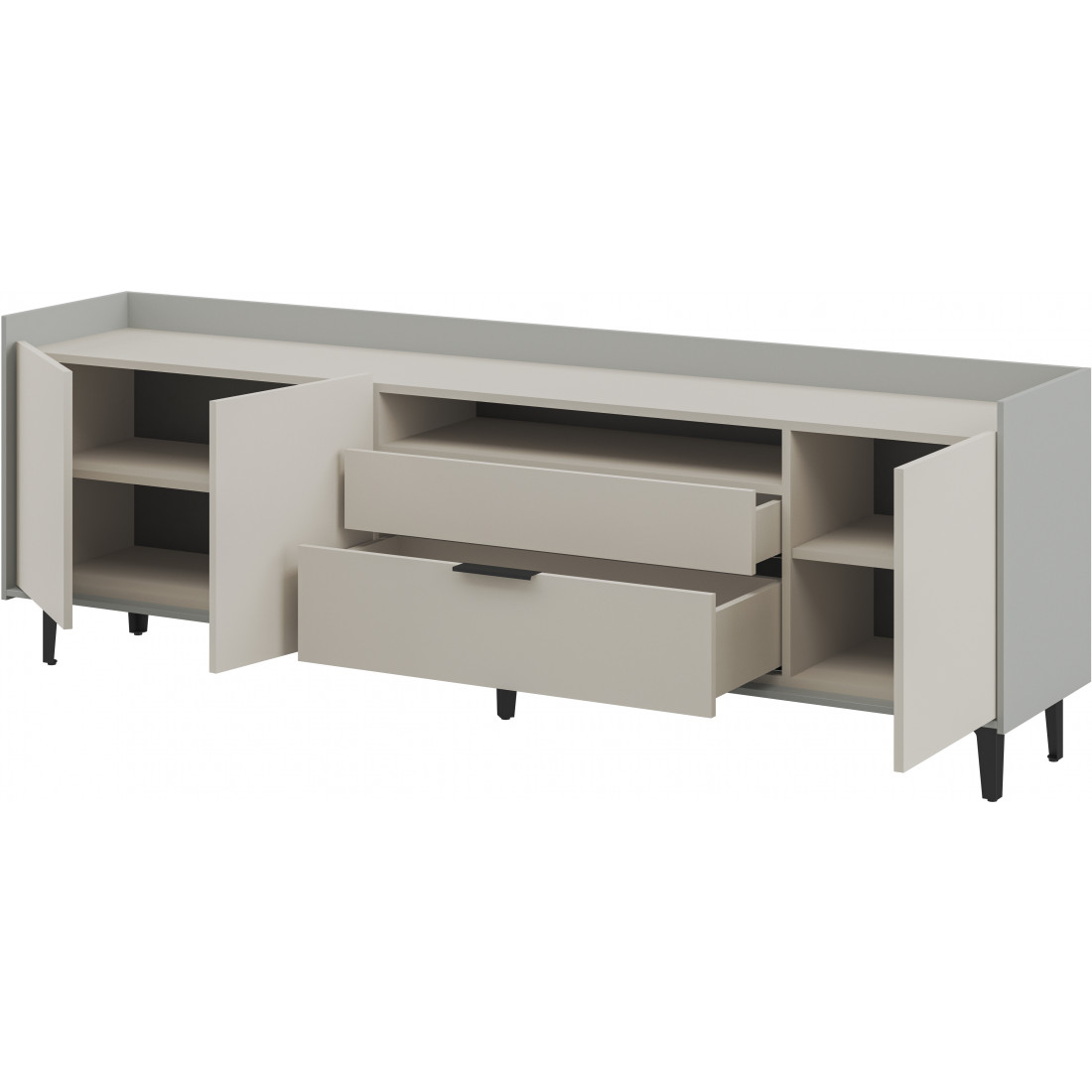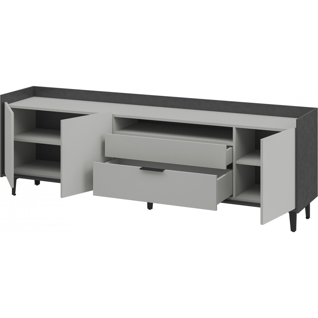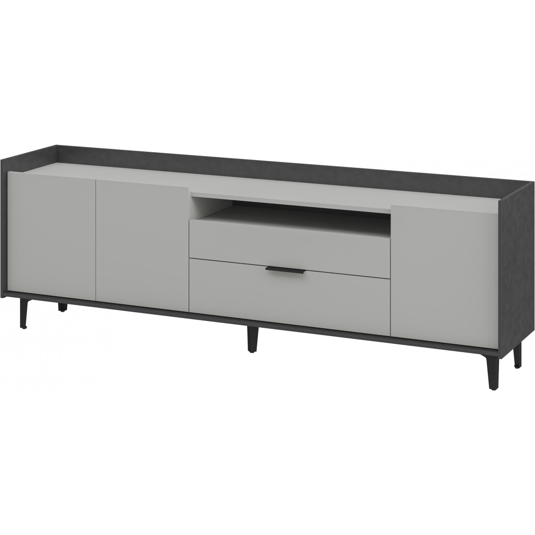 Элегантная тумба под ТВ Модена станет идеальным дополнением для вашей гостиной. Выберите из трех стильных вариантов цветов: Белый-Дуб Элисон, Лунный камень-жемчуг, Металл Бруклин-лунный жемчуг. Ножки из металла обеспечивают устойчивость. Длинная тумба предлагает два отделения с полками для размещения аудио- и видеоаппаратуры, а также одно отделение с двумя удобными ящиками. Над ящиками расположена ниша для мелочей. Эта тумба сочетает в себе функциональность и стиль, делая ее идеальным решением для вашего медиацентра в гостиной